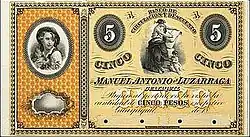 In November 1860, the Banco del Ecuador began operations in Guayaquil under authorization of General José Antonio Gómez Valverde.[18] Initially, it operated with banknotes ceded by the Bank of Manuel Antonio de Luzarraga, but later it put its own banknotes into circulations with denominations of 2 and 4 reales, and 1, 5, 10, 20, 100, 500, and 1,000 pesos. The bank was given permission to issue up to 500,000 Pesos, and was allowed to maintain reserves of up to 50,000 pesos in silver coinage. Later, in 1861, the National Convention granted the bank a further right to mint 200,000 pesos worth of coinage.[19] While it is unclear how long the bills were in circulation, there was a dispute in the 1860s about the banknotes that General Guillermo Franco authorized, but the Jefe Superior rejected as legal tender.[20]