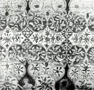The main silver branches of the frieze of the Sheki Khans' palace are surrounded by realistically depicted flowers; a large amount of silver was used here, with the colours being lighter while the patterns in there are presented in darker colours.[12] The patterns on the frieze are also repeated on the tympanum panels.[12]
