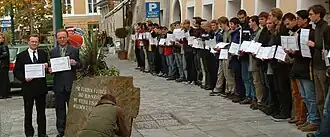 The project couldn't be realized in the following years but the idea of taking responsibility remained.[6] In 2005 the owner of a house close to where Hitler was born offered his house for the project. In 2002 members of the Gedenkdienst remembered the Austrian Righteous Among the Nations in front of Hitler's birth house.[7] In October 2009 mayor Gerhard Skiba argued for the first time in support of a 'House of Peace' or 'House of Responsibility' in Hitler's Birthhouse in Austria's Newspaper Kurier.[8]