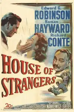 House of Strangers is a 1949 American drama film directed by Joseph L. Mankiewicz and starring Edward G. Robinson, Susan Hayward, and Richard Conte.[2][3] The screenplay by Philip Yordan and Mankiewicz (who chose to go uncredited) is the first of three film versions of Jerome Weidman's novel I'll Never Go There Any More, the other two adaptations are the Spencer Tracy western Broken Lance (1954) and The Big Show (1961).