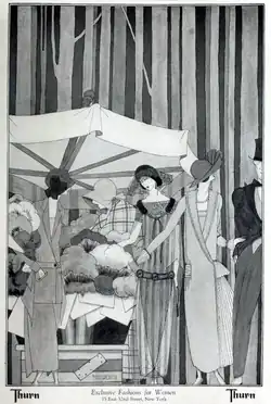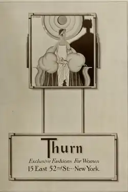 In 1922, Thurn placed an ad in Arts & Decoration magazine stating that its styles were "absolutely exclusive" enabling its customers to differentiate themselves from all other women.[37] A year later, Hague described her role as designer: "I make each gown for some specific type of woman. I see her, in my imagination, long before I begin to choose fabrics or to sketch details. I begin to picture her while I study the style tendencies of the season, and when I review the early collections of the great Paris houses; ... a skilled designer can do much by subduing, emphasizing and supplementing, to develop new aspects of a woman's charm."[1] Regarding the designs themselves, Hague said, "Thurn makes clothes for ladies. That is a hackneyed word I know. But how shall I put it? Our collections are always notably restrained... Our clothes are wearable. "That is why so many American women come to us, I think, instead of going to Paris for gowns."[16]