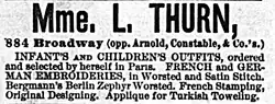 Thurn's founder was a German immigrant named Caroline Sidonie Dittmarsch, who in the mid-1860s had married a teacher named Leopold Thurn.[4] After operating briefly in partnership with the head of a girls' school, Sidonie opened the first of the Thurn clothing shops in 1870.[3]: 75 [5] At that time, both the business and the proprietor were called either Madame L. Thurn or simply Madame Thurn.[6] In 1873, Thurn moved from its original Brooklyn location to one on Broadway two blocks north of Union Square.[7] It made children's clothing and accessories from Parisian designs and custom-fitted them to its customers, adding embroidery and other enhancements as requested.[6][8] In 1880, Thurn moved to 288 Fifth Avenue, the first of a succession of Fifth Avenue locations.[9] In 1890, the shop moved further uptown to 426 Fifth Avenue and remained there until 1913 when the entire block was torn down to make way for construction of the flagship building of the Lord & Taylor department store.[10][11]
