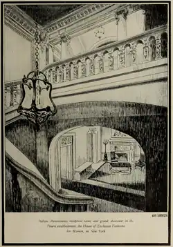 In 1914, Thurn occupied its final and principal location at 15 E. 52nd Street in Manhattan.[30] The building had been constructed in 1903 as a private residence for the sales director of the Procter & Gamble soap company. Designed by the American architect Donn Barber, the building featured imported marble and was said to be one of the finest mansions in the city.[31] Thurn had the interior of the upper floors modified for the use of its dressmakers but left intact the facade and ground floor with its elegant curved staircase (see Image No. 1, above). The twenty-one-year lease had an aggregate rental of $500,000.[31] When Thurn opened in the new location, the neighborhood was in a transition from residential to commercial. The Vanderbilt family had sold its properties along nearby Fifth Avenue and prestigious retail firms, such as the Cartier jewelry store, were taking their place. Hague later recalled that she and her mother perceived the 52nd Street location to be more prestigious than 57th Street.[3]: 76 [32]
