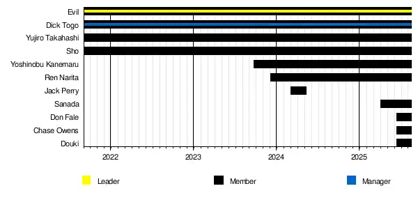 At Dominion 6.15 in Osaka-jo Hall on June 15, 2025, Don Fale, Chase Owens and Douki joined the stable. Douki and Sho won the IWGP Junior Heavyweight Tag Team Championship that same night and Evil defeated David Finlay in a Dog Collar Deathmatch to end the feud with the War Dogs.[25] On July 4 at the New Japan Soul: Night 8 show, Narita, Sho and Yujiro lost the NEVER Openweight Six-Man Tag Team Championship to Wato, Yoh and Toru Yano.[26] From July 19 till August 17, Narita and Evil participated in G1 Climax 35 (B and A Block respectively), with Narita failing to advance out of his block on tiebreak with a 5—4 record;[27] Evil won his block with a 7—2 record,[28] defeated Yota Tsuji in the semifinals,[29] but lost to Konosuke Takeshita in the final,[30] ending his chance to become a two-time G1 winner.