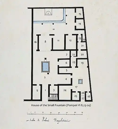 The House of the Small Fountain (Casa della Fontana Piccola, VI.8.23), aka House of the Second Fountain or House of the Landscapes,[1] is located in the Roman city of Pompeii and, with the rest of Pompeii, was preserved by the eruption of Mount Vesuvius in or after October 79 CE. It is located on the Via di Mercurio, a street running north from the Arch of Caligula, at its crossroads with Via delle Terme, and Via della Fortuna, to Pompeii's fortification tower XI in the northwest part of the city. The street is named after a public fountain at VI.8.24 with a relief of the god, Mercury. Insula 8 is on the west side of the street. The house is named after a mosaic fountain adorned with shells at the rear of its peristyle. The property is immediately adjacent to the House of the Large Fountain (VI 8,22,1), a structure with an even larger mosaic fountain adorned with shells and marble sculptures of theatrical masks excavated earlier in 1826. So the size difference between the fountains was used to distinguish the two structures.[2]