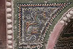 The temple-style fountain with a marble-clad basin and apsidal niche constructed of brick against the west wall is plastered and decorated with mosaic tiles and sea shells. Scenes depict cavorting dolphins and colorful parrot-like birds. Originally, water spouted from the open mouth of a comic theatre mask depicting an old bearded man in the apse but the marble sculpture is no longer present. Above the water spout depicted in mosaic is a river god. Behind the fountain, a mural of a garden with trees and fluttering birds behind a white fence is painted in a central panel within a red ground above an ochre dado demarcated by white columns with red bases. To the left of the fountain is a badly faded landscape of a columned temple with round two-level tower. To the right of the temple is another landscape with multi-storied structures. The ocher dado is punctuated with panel paintings of mythical sea creatures and dolphins.[12]