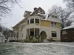 The Wally Thurow House is a 1917 American Foursquare with a brick exterior and oak interiors. The Four Square style was a reaction to the complexity and excess found in Victorian and Revival style homes that were popular in the later half of the 19th century. Incorporating elements of the Prairie School, pioneered by Frank Lloyd Wright, and American Craftsman styles the two-and-a-half-story house exhibits the classic boxy shape, a mostly hipped roof, and a central dormer. The front facade is dominated by a brick porch supported by two large pillars.[16]