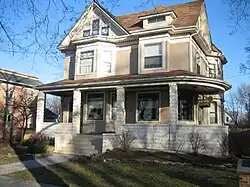 J.H. Rogers settled in Sycamore in 1858. He was a highly respected dry goods merchant and associate of George R. Wild. Wild's House is another of the Sycamore Historic District's notable homes. Later in his dry goods merchant career he worked without Wild.[2] His c. 1890 home is a blend of Queen Anne style and Romanesque Revival architecture.[15] The distinctly Queen Anne turret on the home's northwest side is offset by the distinctly Romanesque arch over the front doorway.