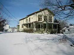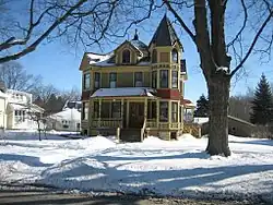 The Dr. Olin H. Smith House is located in the 800 block of Somonauk Street in Sycamore. The house was constructed between 1870 and 1877 for Dr. Olin H. Smith.[2][5] Smith, who was the town's first dentist, was raised in Sycamore and attended Sycamore schools before going to medical school in Philadelphia. He was born October 15, 1856, in St. Johnsbury, Vermont, the youngest of six children of Martha L. and James M. Smith. On arriving in Sycamore in 1857, the family first settled in a simple farm house on what is now the 800 block of Somonauk Street, before constructing the present house. In 1900 he was elected mayor, a time during which he worked to bring more industry to the city. Dr. Smith died in Sycamore on August 5, 1939. His wife, Lillian Babcock Smith, and daughter Rose Smith Mussell, continued to live in the house until their deaths in 1947 and 1950, respectively. In 1950 the house was sold out of the family.[5]