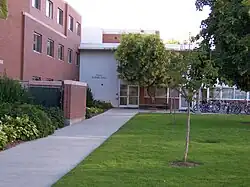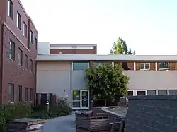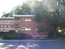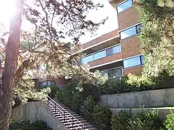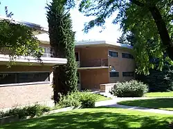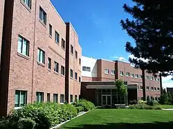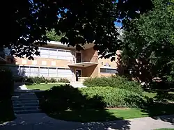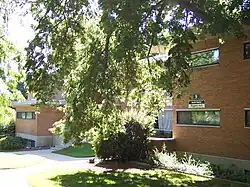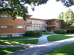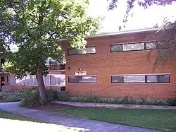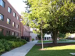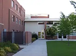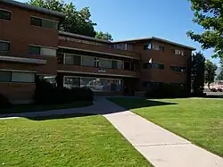 The dining building was christened the George Q. Cannon Building and at the time could accommodate 1,800 people.[6] In addition, both a pool and a "recreation field," which included eight tennis courts and four softball fields, were completed for the use of residents.[7][8] Two more residence buildings were already under construction when the completion of the original Helaman Halls Complex was announced on September 18, 1958.[9] The two new buildings were opened for use in September 1959, and housed 234 women each, bringing the total occupancy number of the complex to 1638.[10] In 1959, the semester rent for Helaman halls was approximately $23 per term.[11] Another building was added in 1970,[12] and a new hall was built in 2010.[13]