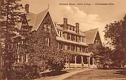 When Smith College first opened its doors to students in 1875, there were few precedents for how a women's college should build its dorms. Unlike the two already existing women's colleges, Mount Holyoke and Vassar, the Smith trustees decided to abandon the model of a large building with many individual student rooms. Instead, they took over a house that had belonged to a local family, Dewey House, in order to give their students a domestic space. Dewey House, designed by Thomas Pratt in 1827 for Charles A. Dewey, was a three-story home with a front porch, parlor, large dining room, and a bedroom for each of the incoming students.[1]