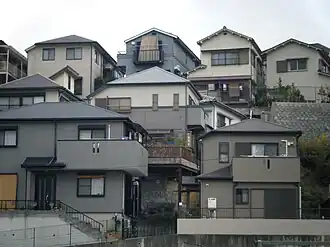 As in America, most Japanese live in single-family housing.[5] During the postwar period, the number of multi-unit dwellings in Japan increased rapidly. In 1990, for instance, 60% of Japanese dwellings consisted of single-family homes, compared with 77% in 1958.[6] Two years earlier, in 1988, 62.3% of the total housing units in Japan were single-family units and 37.7% were multiple-unit dwellings.[7] That same year, a survey carried out by the Japanese economic planning agency showed that 62.3 per cent of the Japanese population owned a detached two-storeyed house.[8]