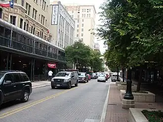 The road now known as "Houston" was originally called "Rivas Street" east of the river and "El Paseo del Rio" west of it. The two sections formed what was essentially a backroad with limited commercial development.[1] Historically, most of the town's business flowed through the Alameda — now "Commerce Street".[2][3] The Alameda was the city's most important thoroughfare, as it connected the two town squares: Alamo Plaza and Main Plaza.[2] For the first century and a half of its existence, this road prospered as the city's main street and center of gravity. However, by the late 19th century, Commerce Street had become overburdened by grime, congestion, and the stench of mule and horse-drawn vehicles.[1][2]