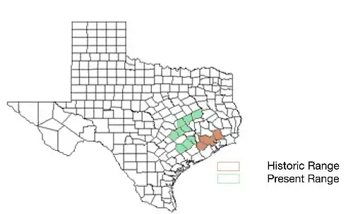 The Houston toad is generally found in areas with loose, sandy soils greater than 40 in (100 cm) in depth and large rolling uplands. Slow-moving or still bodies of water that last at least 30 days are needed for breeding and tadpole development.[17] The toad's original range covered 12 counties in Texas; currently, it is believed to occur in nine counties.[1] However, choruses have only been actually reported in three counties since 2000, representing a seventy-five percent overall reduction in twenty years. Vegetation of its preferred habitat includes loblolly pine, post oak, bluejack oak, yaupon holly, curly threeawn, and little bluestem. They are typically found in water sources such as shallow ponds, rain pools, flooded fields, or man-made ponds which can occur for up to 30 days during the breeding and egg/tadpole development process.[16]