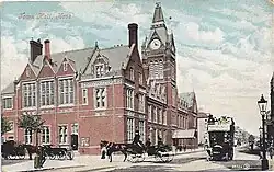 The original town hall in Hove was built by Alfred Waterhouse and opened in 1882. It was built in the gothic style, out of red brick, terracotta and Portland stone, and contained a 2,000 capacity great hall with three balconies, and a 110 feet (34 m) tall tower in the central facade. The building cost around £50,000.[4][5][6][7] The organ was built by Henry Willis, and was sold in 1959.[6] The tower contained a clock and carillon of 12 bells by Gillett, Bland & Co.;[8] their combined weight made them the heaviest bells in Southern England in the late 19th century.[9]