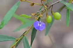 The erect and slender shrub or small tree typically grows to a height of 0.4 to 3 metres (1 to 10 ft).[2] It is usually single stemmed and the young branches are covered in spreading often rust coloured hairs. The stipules are narrow triangular and around 1 millimetre (0.039 in) in length.[4] The alternately arranged leaves have an elliptical blade to around 7.5 centimetres (3.0 in) in length.[5] The species has purple or blue flowers that appear between August and December in its native range.[2] The pea shaped flowers are arranged in short clusters among the leaf axils.[5] The axillary inflorescences contain one to seven flowers. The seed pods that form later are ovoid to ellipsoid in shape and are 0.8 to 1.2 cm (0.31 to 0.47 in) in length and 0.8 to 1.3 cm (0.31 to 0.51 in) wide. The olive brown seeds within have an elliptic shape and 3.8 to 5.1 mm (0.15 to 0.20 in) in length and 2.8 to 3.1 mm (0.11 to 0.12 in) wide.[4]