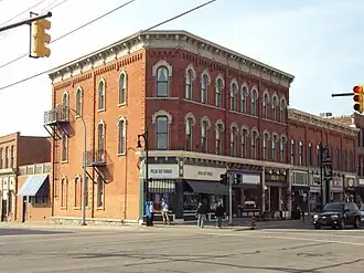 The Howard Block is a three-story red brick High Victorian Italianate commercial block, with a two-story rear section added in approximately 1880. The building is set on the corner of Huron Avenue and Quay Street, and the footprint matches the sixty-five-degree angle between Huron Avenue and Quay Street. Three storefronts run across the Huron Avenue facade. At the corner, a narrow, one-window-bay wide section which originally held an entryway, faces diagonally toward the intersection. The second and third stories hold round-head window openings with sculptural iron caps. A wooden bracketed main cornice, restored in the 1990s, runs across the top.[2]