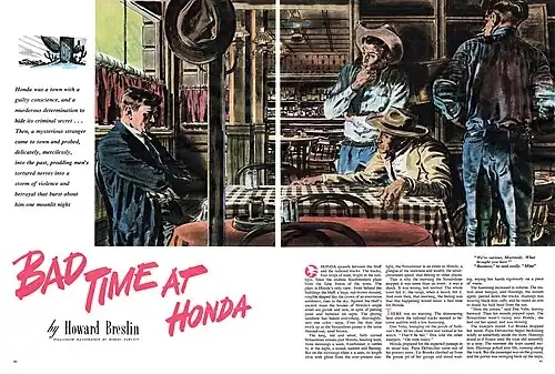 In 1946 he wrote the short story "Bad Time at Honda", and it appeared in The American Magazine in January 1947, with full-color illustrations by Robert Fawcett.[4] That story became the film Bad Day at Black Rock, the script adapted by Don McGuire and Millard Kaufman, directed by John Sturges, and starring Spencer Tracy.[5]