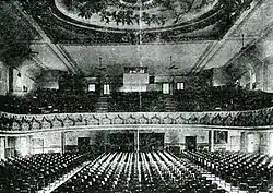 Constructed in 1910,[3] the theater was founded and owned by the National Amusement Company, a white-owned group.[4] When built, it had a capacity of more than 1,200.[4] Designed by J. Edward Storck,[3] the theater featured orchestra and balcony seats and eight proscenium boxes, with a lavishly decorated interior.[7] No less extravagant was the exterior, which combined elements of the Beaux-Arts, Italian Renaissance, and neoclassical styles.[7] The whole was surmounted by a larger than life statue of Apollo playing his lyre.[7]