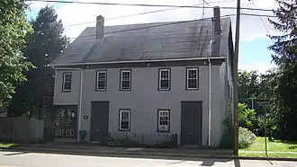 Built of brick, the tavern rests on a foundation of stone and is covered with a gabled roof. The facade is divided into three bays: on the second floor, the right and middle bays are pierced by two windows, while the left bay is only wide enough for one window. From right to left, the five windows sit above a door, a window, a window, a door, and a porch-like window.[4] The original building is two-and-a-half stories tall, built as a rectangle, although a later two-story addition on the northwestern corner causes the whole building to resemble the shape of the letter "L".[2]