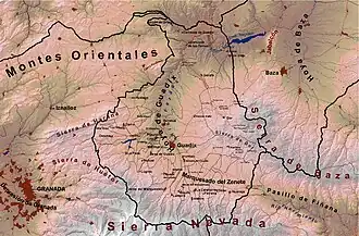 The Hoya of Guadix (Spanish: Hoya de Guadix) is a natural plain in the northern part of the province of Granada, Andalusia, Spain. It covers some 500 square kilometres (190 sq mi), and is formed by the basins of the rivers Fardes and Guadix.[1] It is surrounded by the heights of the Sierra Nevada to the south, the Sierra de Baza to the east, the Sierra Mágina to the north and the Sierra Harana to the west. It is separated by the Cerro Jabalcón from the Hoya of Baza which, like the Hoya of Guadix, is one of the series of valleys forming the Surco Intrabético.