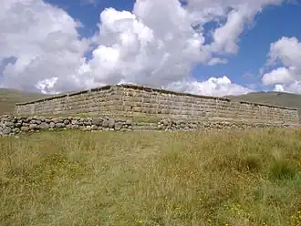 Huánuco Pampa,[1][2][3] Huánuco Marka[3][4] (also spelled Huánuco Marca)[1] or Huánuco Viejo,[1][3] Wanako Pampa, Wanuku Pampa or simply Huánuco is a large archaeological site in Peru in the Huánuco Region, Dos de Mayo Province, La Unión District. The ruins of the city lie on a plateau above the Urqumayu or Vizcarra River in the central Andes.[5] The Incas administered their large empire through a small number of administrative centers, such as Huánuco Pampa. The administrative centers were linked by the extensive Inca road system. The most important of the roads, the Qhapaq Ñan, which ran from Cusco to Quito, passed through Huánuco Pampa. The Inca authorities in Huánuco ruled at least five, and perhaps more, ethnic groups.[6] The city is situated on an important commercial trade route and sits on top of a plateau with ravines on all sides in order to allow easy defense of the city. During the Spanish conquest of the Incas, Huánuco Pampa was briefly occupied by Gomez de Alvarado,[7] who founded a Spanish city but it was quickly moved to Pillco[8] because of the harsh climate of Huánuco and the raids of Illa Tupac, one of the captains of Manco Inca.