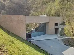 The new museum was completed in 2010. It was built into a small hill, with the majority of the building front being made of glass. The entrance to the building opens up into a large oval atrium of grey concrete, the opposite of which is a broad screen which continuously plays documentary films on Krapina Neanderthals. The passage up to the second floor is of a circular shape, with museum pieces being placed in the open space, as well as along the painted walls.[6]