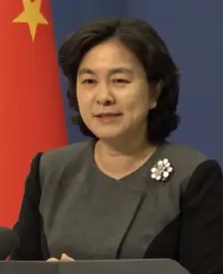 In 2012, Hua was promoted to deputy director general of the Department of Press, Communication, and Public Diplomacy of the Ministry of Foreign Affairs.[2] She served concurrently as the spokeswoman for the ministry.[3] In February 2018, during a prolonged absence at the Foreign Ministry, there were reports that Hua was investigated for storing large amounts of U.S. dollars in her home. On March 1, 2018, Hua returned to work as Foreign Ministry spokeswoman.[4]