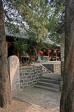 The Huayang Palace (pinyin: Huayang Gong, literally "Glorious Sun Palace") is a primarily Taoist temple located at the southern foot of the hill on gently sloping terrain. Its founding during the Jin dynasty (in the year 1220) is attributed to Chen Zhiyuan, a disciple of the Quanzhen Taoist Qiu Chuji, who in turn was the foremost disciple of Wang Chongyang, the founder of Quanzhen Taoism. The original purpose of the building was to serve as a Taoist temple dedicated to the "Five Color Gods" (pinyin: Wu Di) representing east (pinyin: Qing Di, green), west (pinyin: Bai Di, white), north (pinyin: He Di, black), south (pinyin: Chi Di, red), and center (pinyin: Huang Di, yellow). Over time, the temple has also come to include sites of worship for Buddhism and Confucianism.
