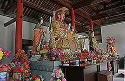The present-day entrance to the complex is the gate to the inner courtyard of the palace; the outer courtyard has not been preserved. The gate currently standing dates back to the Ming and Qing dynasties; there is no record about the previous gates which are likely to have previously occupied its place. The gate building houses the statues of the "Four Zhi Gong Cao" (pinyin: Si Zhi Gong Cao), four minor deities (Year Zhi, Month Zhi, Day Zhi, and Hour Zhi) that are thought to be positioned on the border between heaven and earth in order to fulfill book- and gate keeping duties.