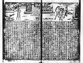 A huaben (Chinese: 话本; pinyin: huàben) is a Chinese short- or medium-length story or extended novella written mostly in vernacular language, sometimes including simple classical language. In contrast to a full-length Chinese novel, it is generally not divided into chapters and recounts a limited number of characters or events, although some huaben fictions, such as Sanguozhi Pinghua, contain upwards of some 80,000 Chinese characters. The earliest huaben are reported in the 12th century during the Song dynasty, but the genre did not see its true artistic and creative potential until the Ming dynasty, and after the mid-17th century did not produce works of originality. In the development of Chinese fiction, the huaben are heirs of the zhiguai xiaoshuo, chuanqi, bianwen (Buddhist tales), and are the predecessors of the stories and long-length novels of the Ming.[1]