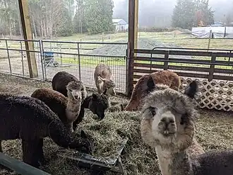 The Huacaya alpaca is a breed of alpaca (Lama pacos) that has a unique appearance and fiber quality.[1] This breed is the most popular alpaca breed with population numbers reaching 2.8 million in Peru alone.[2] They share biological components with other species in the Camelidae family. Their digestive tract, nutrition requirements, and herd behavior mirror that of all camelids. They also survive amidst similar predation, poison, and disease threats that endanger all camelids alike.