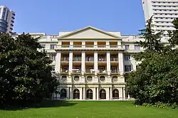 The hospital was established in 1921 as the Country Hospital,[2] known in Chinese as Hong'en Hospital (宏恩医院).[3] Its main H-shaped building on Great Western Road (now Yan'an Road), opened in 1926, was donated by an anonymous British businessman to the Shanghai Municipal Council, the governing body of the Shanghai International Settlement. Designed by the Hungarian-Slovak architect László Hudec and constructed by the firm Pan Rong Ji (潘荣记),[3][4] it is now protected as a Municipal Heritage Building of Shanghai.[3]