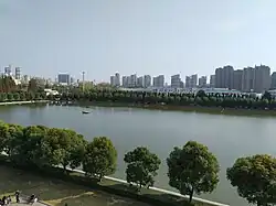 In Jian'an 5 (c. 200), near the beginning of the Three Kingdoms period, the Guangling commander Chen Deng—then subordinate to Lü Bu—constructed the first 30-li section of the Gaojia Dike (高家堰, Gāojiāyàn) to minimize damage from flooding along the Huai.[7] He also expanded the Hangou Canal westward and combined the small Fuling lakes into a single Pofu Pond to assist with irrigation.