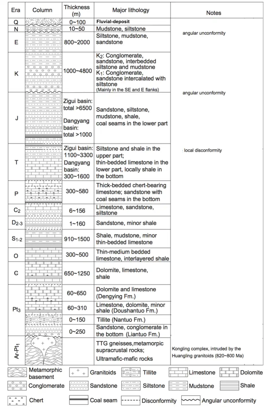 The geology time range of Huangling Anticline is from the Archean to Mesozoic Cretaceous. The overlying rocks are sedimentary rock from the Neoproterozoic to Cretaceous.[3] Here, three lithological units will be introduced.