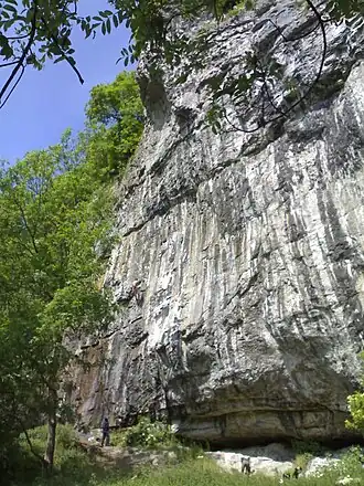 ![]() Raven Tor crag, Miller's Dale; Hubble starts at the left side of the cave below the centre of the wall | |