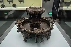 It is discovered in 1978 at the Marquis Yi of Zeng tomb in Suizhou City, Hubei Province. It is one of the representatives of Chinese bronze craftsmanship and also the pinnacle of bronze wares from the Shang and Zhou dynasties. It consists of a vase and a plate. The vase is 30.1 centimeters tall and 25 centimeters in diameter, while the plate is 23.5 centimeters tall and 58 centimeters in diameter. Its shape and patterns are extremely complex and exquisite.[4]