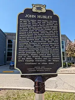 In 2021, a crowdfunded campaign headed by the Animation Education Association to have a Wisconsin State Historical Marker for Hubley placed in Marinette, Wisconsin, reached its goal.[180] The marker was unveiled on May 20, 2023.[181] To coincide with the unveiling, May 20, 2023, was proclaimed "John and Faith Hubley Day" in Wisconsin by Marinette's mayor Steve Genisot.[182]