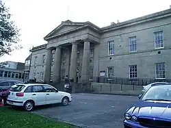 The original hospital in Huddersfield, which was designed by Joseph Kay and which was located at New North Road, opened in 1831.[1] Additions included the south wing in 1861, the north wing in 1874 and the Carlisle Wing, financed by a gift from Sir Hildred Carlile, in 1898.[2] The foundation stone for a further extension was laid by the Duke of York in 1932; it was opened by Lord Moynihan in 1934.[1]