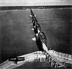 CNoR refused to build further north without massive government assistance.[32] That year, the Government of Canada committed to constructing a line north from The Pas, and in 1910 the Hudson Bay Railway was formed. Mackenzie and Mann, the successful bidders, bridged the river in 1910–1911, and between 1910 and the start of World War I in 1914, laid steel 538 kilometres (334 mi) to Kettle Rapids (located at present day Gillam). Port Nelson, 160 kilometres (100 mi) away, had been selected as the terminus owing to the shorter distance and easier terrain.[33][34][35] The town site was cleared and infrastructure erected from 1912, and the completed rail bed reached there, but resources diverted for the war effort limited the latter project. All town and railway construction ceased in 1917, leaving a ghost town.[1]