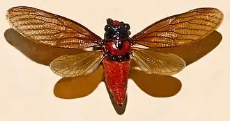 - ^ a b Ibrahim, Ali bin; Leong, T.M. (2009). "Records of the black and scarlet cicada, Huechys sanguinea (De Geer) in Singapore, with Notes on its emergence (Homoptera: Cicadidae: Cicadettinae)" (PDF). Nature in Singapore. 2: 317–22.
