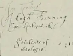 ![]() Hugh Binning's signature from the Solemn League and Covenant (5 December 1643) | |