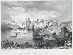 Hughes's major woodcuts appear in his Beauties of Cambria (Carmarthen, 1823) in which all the views were engraved by himself, 58 from his own drawings; he has been compared to Thomas Bewick. He also made lithographs of Welsh scenery. He made caricatures of the commissioners of education sent to Wales (1846–47). Some of his sketches, including a map of North Wales under the name Dame Venedotia, Pitt's Head near Beddgelert, and others of the neighbourhood of Snowdon, were published at Caernarfon. His sketch of Pwllheli and St. Tudwall's Road is in Humphrey's Book of Views.[2][3]