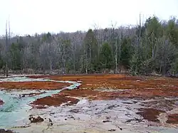 Today, this devastated area has been compared with that of the Yellowstone Mud Pots. All that remains is bare flooded and yellowish red soil periodically spotted with dead standing trees. It also contains a large amount of green iron eating algae that adds to the color of the area. Efforts are currently underway in an attempt to mitigate the situation.