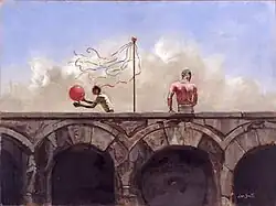 Mr. Lee-Smith's paintings usually have spare settings suggestive of theater stages or bleak urban or seaside landscapes. Walls stretch out under gray skies. Men and women, as lithe as dancers, seem frozen in place. Most are dressed in street clothes; some wear exotic masks. Children frequently appear, as do props reminiscent of circuses. The work has an air of mystery associated with the paintings of Giorgio de Chirico and Edward Hopper.[3]