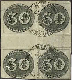 The key item of Brazil was the 30 reis interpane Bull's Eye block of four which sold for CHF 360,000 including buyer's premium. It was discovered by Luiz Figueiredo Filho only in 1950 who bought it at Coda Philatelic House in Rio de Janeiro. The block, used 1845, proved the existence of a third plate for the stamp as theorised by George Napier (died 1942) and is the only surviving example of an interpane 30 reis. From Filho it then passed into the collection of Niso Vianna who exhibited it in award-winning collections in the 1950s and 60s. It was then owned by Reynaldo Bruno Pracchia who exhibited it throughout the 1970s and included it in his Championship Class Grand Prix winning exhibit at London 1980. He sold it in 1986 to the David Feldman firm along with other items and in 1987 it was bought at a Feldman auction by Paulo Comelli for Angelo Lima who also won awards with it. The piece was eventually acquired by Hugo Goeggel in 1995.[2]