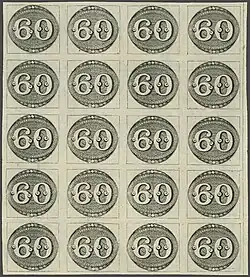 In 2013, Corinphila auctions sold items from Goeggel's gold medal-winning[9] collections of Brazil, Colombia and Ecuador over two sales on 27 February and 18/19 September respectively. The sales included one of the most important collections of the "Bull's Eye" stamps of Brazil ever formed. The lots included the mint 60 reis block of twenty, the second largest multiple of this stamp known, and hundreds of other examples of mint and used stamps and stamps on cover.[1] The sale of the Bull's Eyes in Part 1 alone, raised over CHF 1.3 million including buyer's premium (over US$ 1M).[10] A further sale of Colombia took place on 20 May 2014.