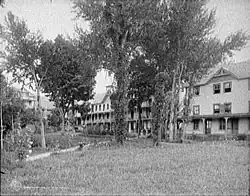 The first Lakeside Inn was constructed for John W. Hall in 1877–1878 on a 1 acre (0.0040 km2) lot.[7] Although the only direct access to Huletts Landing was by ferry, a combination of train, coach, and ferry was normal for Adirondack vacationers of the period.[6][7] Huletts Hotel grew from expansions on the original farmhouse until a fire destroyed it on 14 November 1915.[7] It was hastily rebuilt for the 1916 tourist season, but questions of arson arose, and led to trial.[8] Tourism has continued to be a mainstay of the community's economy. Adirondack Park was originally established in 1892.[6] In 1931, an eastward expansion brought Lake George and its communities within park boundaries.[6]