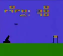 Human Cannonball is a non-military variant of an artillery video game released in 1979 by Atari, Inc. for the Atari VCS (later renamed the Atari 2600).[2] The goal is to launch a performer from a cannon so they land in container of water supported by a tower. The game was in the first wave of Atari VCS games after the original nine launch titles.[3] It was also among the first games for the console to be discontinued by Atari.[4]