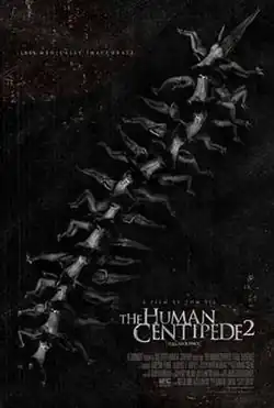 The Human Centipede 2 (Full Sequence) is a 2011 psychological body horror film[5] written, directed, and co-produced by Tom Six. An international co-production of the Netherlands and the United Kingdom, and the sequel to Six's 2009 film The Human Centipede (First Sequence), the film stars Laurence R. Harvey as a psychiatrically and intellectually impaired English man who watches and becomes obsessed with the first Human Centipede film, and decides to make his own "centipede" consisting of 12 people by using crude and violent techniques to connect their lips to each others buttocks, including Ashlynn Yennie, an actress from the first film.